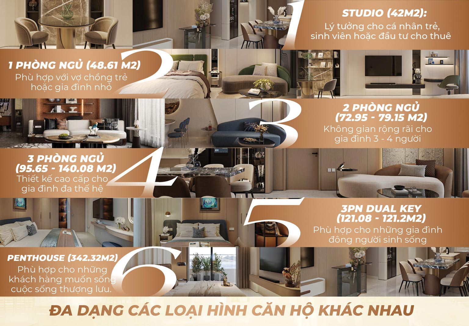 - Loại hình căn hộ: Studio, 1 BR, 2 BR, 3 BR, Penthouse